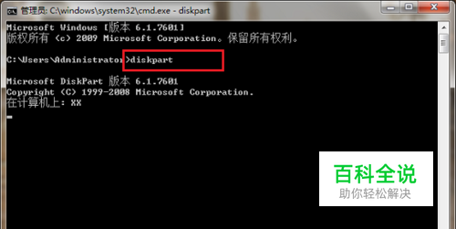 第二步进去之后,在命令提示符输入diskpart命令,按回车键进行启动diskpart程序,如下图所示: