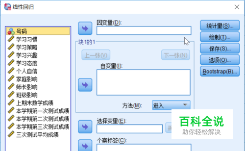 选择自己所需要的自变量,按照图中所示加入【自变量】方框中 选择自己所需要的因变量,按照图中所示加入【因变量】方框中