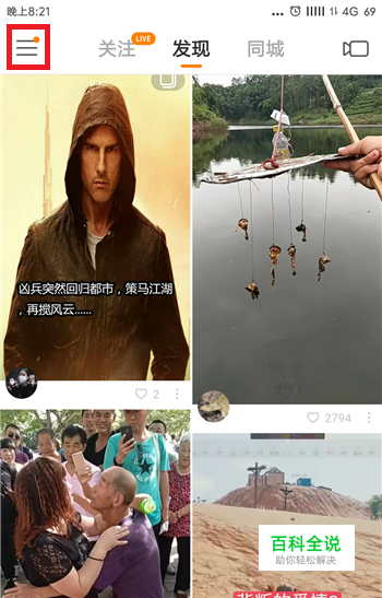 进入到快手的推荐视频界面中点击左上角的【三】图标选项。