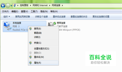 然后找到我们的本地连接,鼠标右键点击一下,然后选择属性并且点击进入到具体设置。