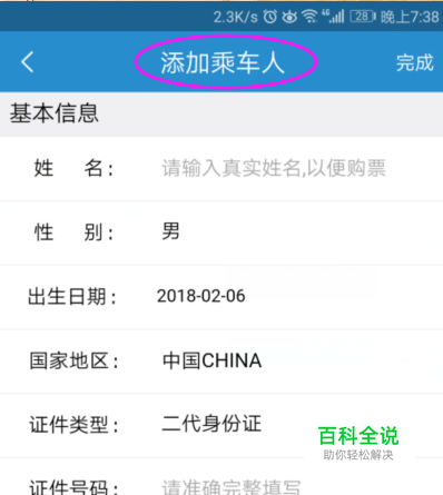 最后,填写玩,点击“完成”,这样就可以添加新的乘车人了。