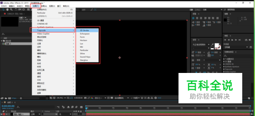 我们虽然复制进去了,但是我们还得检查一下插件是否在AE里面,我们打开AE的软件,然后新建一个合成在新建一个纯色图层。然后打开菜单栏“效果”下面看下是否有Trapcode选项,有选项说明安装成功,在Trapcode选项在点击看是否插件齐全,确认没错就说明真正安装上了。