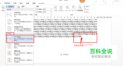 下面介绍如何在不同页上使用不同页眉、页脚和页码,重要的是正确添加分页符。 首先,在确定要使用不同页眉的两页之间添加“分节符(下一页)”,这样上下两页就分布在不同的节,在不同的节之间是可以使用不用的页眉、页脚以及不同的页码的。