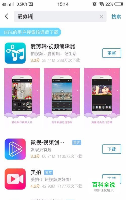 1.首先去手机周边软件搜索爱剪辑进行下载,安装。