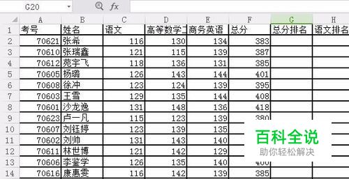 准备一个学生成绩列表,把总分排名和语文进行名次排列