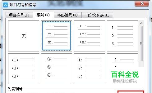 随即弹出【项目符号和编号】对话框,切换到【编号】选项卡,先任意选取一种编号,再点击【自定义】,如图所示