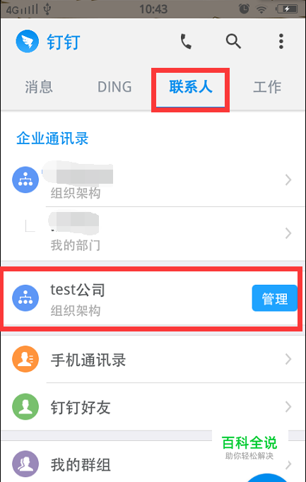 进入钉钉手机端,【联系人】,找到自己建立的公司,【管理】