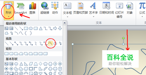 打开PPT,清空版面,设置好背景图片,点击插入选择曲线形状,使用曲线绘制知识树的树干和主体,如图所示,边画边想像真实的树,可以画的高大一些,最后在适当的压缩一下