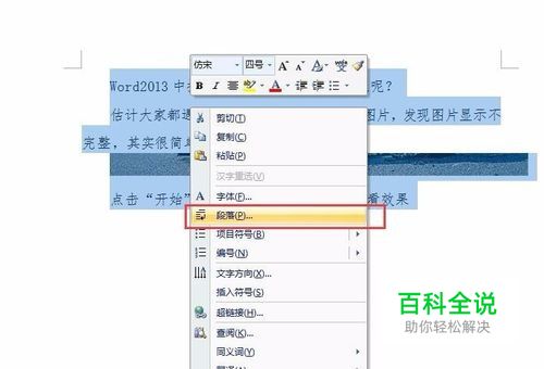 大家会发现可能图片只显示最下面一个长条,还外带线框,无法显示完整的图片; 此时,可以按住鼠标左键选中文字和未显示完整的图片,然后点击鼠标右键,在弹出的快捷菜单中选择“段落”;