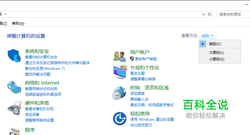 打开控制面板,将右上角的查看方式由缺省的<类别>下拉改为《小图标》,如下图所示。