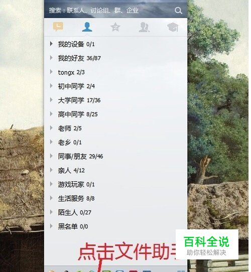 登入QQ后,找到如图下方所示的文件助手。如果你的QQ找不到文件助手,有可能不是新版的QQ,建议在线升级到最新的版本。