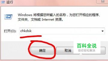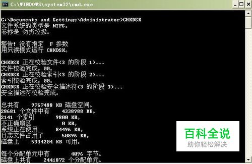 输入chkdsk [volume:][[Path] FileName] [/f] [/v] [/r] [/x] [/c] [/l[:size]]