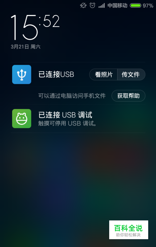 遇到这种情况的时候,大家打开自己手机,查看连接状态,然后有一个“已连接USB调试”,如果确认自己打开了USB调试功能的话,点击该选项。