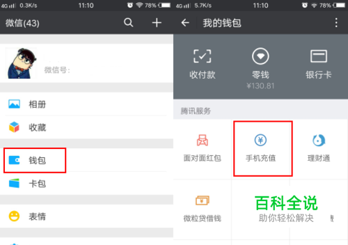 微信上面的回收流程讲解:打开微信之后进入钱包→手机充值。