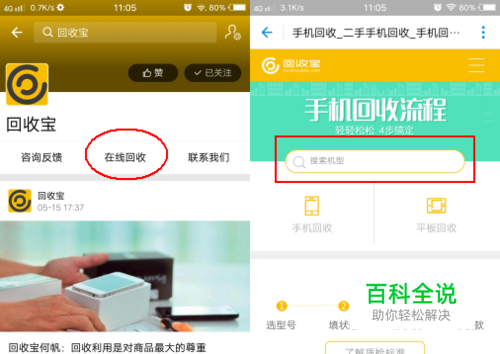 进入回收宝生活号之后,点击“在线回收”就能够进入到估价页面。在估价页面内,输入自己想要出售的手机型号,就能够给旧手机评估价格了。