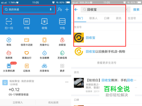 进入支付宝后,在上方的搜索条内搜索回收宝,然后找到回收宝生活号。回收宝生活号,主要满足大家的闲置手机手机变现需求。大家可以在这里卖掉自己的旧手机。