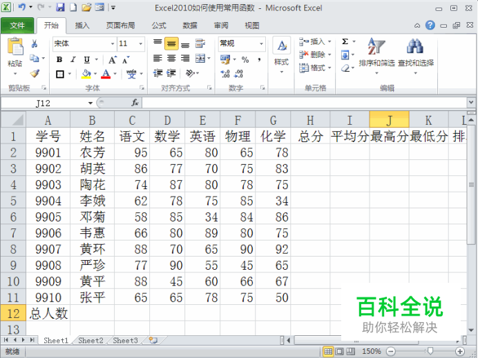 第五个是计数COUNT。在B12输入=count(),在括号号选择数据区A2至A11,敲回车,就求出人数。