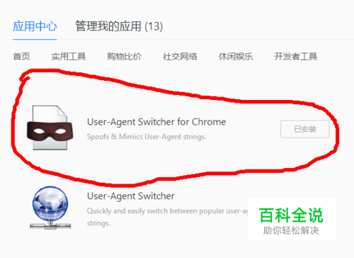 首先打开浏览器(本人用的是QQ浏览器),再应用中心里搜索插件User-Agent Switcher for Chrome