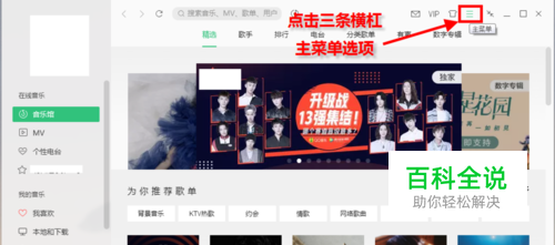 打开电脑版QQ音乐,点击右上角的三条横杠主菜单选项。
