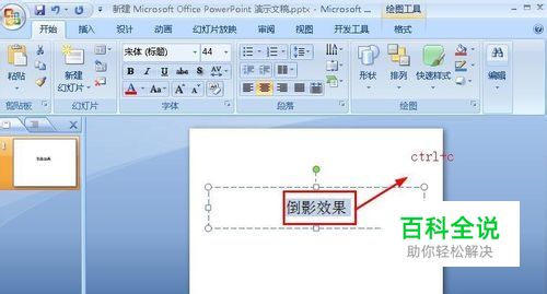 首先我们打开一个ppt,然后输入几个字,笔者输入的是倒影效果这几个字,我们选中这几个字,然后按下ctrl+c,复制这几个字