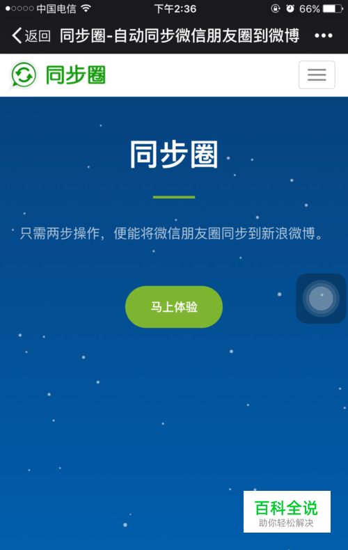 1/进入同步圈网页,点击“马上体验”,绑定好新浪微博。