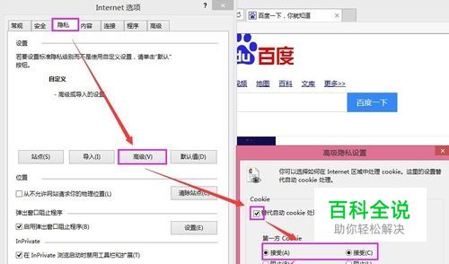 在打开的“ Internet选项”中选择 ‘隐私’选项卡,点击‘ 高级’,在弹出的 高级隐私设置对话框中,勾选 ‘替代自动cookis处理’,并勾选 ‘总是允许会话cookis’,然后点击‘ 确定’保存设置。