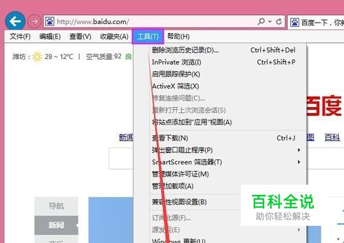 解决方法: 浏览器的菜单栏中单击 ‘工具’,选择 “Internet选项”。