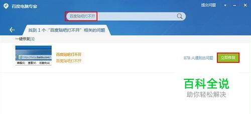建议下载并安装【百度电脑专家】,官网:http://zhuanjia.baidu.com 。打开【百度电脑专家】,在搜索框内输入“百度贴吧打不开”,在搜索结果里面选择【立即修复】,修复完成后重新打开浏览器验证是否可以正常访问百度贴吧: