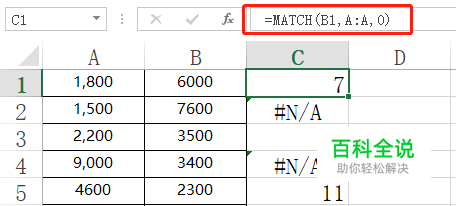 下面这个就是完整的两列数据,B列的3400在A列是找不到的,所以返回错误值,其他返回的数字就是查找值在查找区域所在的行数,像B1的6000就在A列的第7行,所以返回的是7。