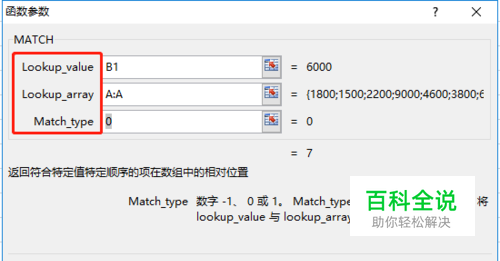 MATCH函数需要填3个参数 第1个:查找什么,选中要查找的数据所在的单元格,这里查找B1 第2个:在哪里查找,选中查找区域,本例在A列查找 第3个:匹配类型,0是精确匹配,1是小于查找值的、最接近的行数,-1是大于查找值的、最接近的行数。基本上查找的时候多数都是要找一模一样的,1和-1很少用到,而且是返回升序排列之后的行数,稍微没那么好理解。