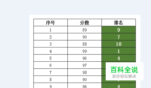 第二步,创建一个表格,列名分别为序号、分数和排名,序号展示前十,分数顺序混乱的,如下图所示: