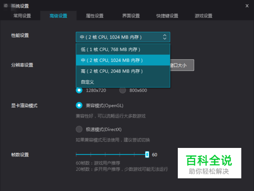 中配:4核cpu,64位的操作系统,内存4G以上; 性能模式设置为高,如下图。