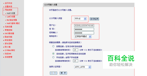 选择网络参数设置WAN口,输入用户名,秘码选择拨号模式,接入类型。