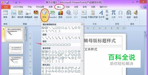 选择插入》形状,点击矩形,先插入一个矩形覆盖掉这张幻灯片。