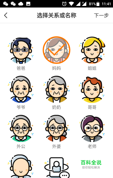 选择你和小孩的关系,然后点击右上角的“下一步”按钮。