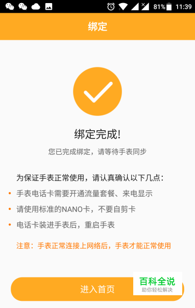 绑定完成。需要确认手表已经插入电话卡,并且电话卡有开通流量。 点击“进入首页”按钮,就可以使用了。
