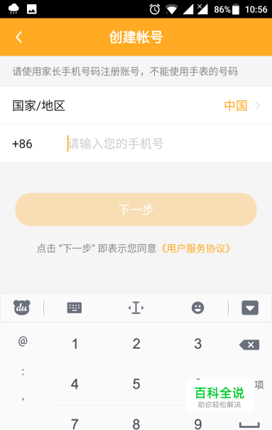 填写家长自己的手机号码,再点击“下一步”按钮。注意:不要填写手表的号码哦