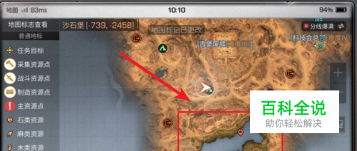 我们进入游戏后,前往沙石堡地图,点击右上方的小地图进入。在沙石堡的地图中,我们选择绿洲进行标记。如下图所示,就是一片水域的地方。