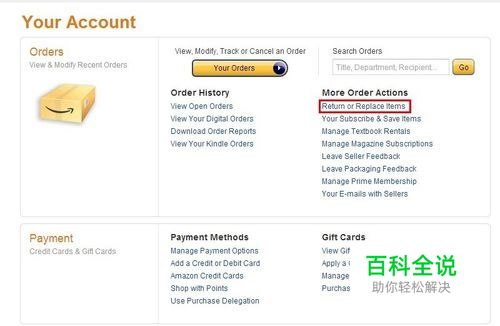 首先登陆美国亚马逊网站www.amazon.com/, 点击右上角的 Your Account,然后点击 Return or Replace Items,见下图