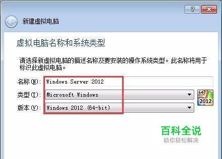 弹出“新建虚拟电脑”向导,在“名称”文本框中输入虚拟机名称;在“类型”下拉列表框中选择“Microsoft Windows”,在“版本”下拉列表框中选择“Windows 2012(64-bit)”,然后单击“下一步”按钮。