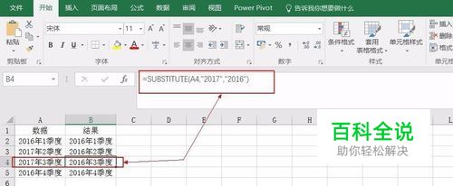 将单元格内指定数据中的某个值,替换为另一个值。 使用函数=SUBSTITUTE(A2,"2017","2016")