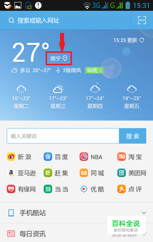一、打开UC浏览器。进入首页,并下划页面。我们就可以看到正上方有天气预报显示。在以标注的红色框内有设置好的地点。