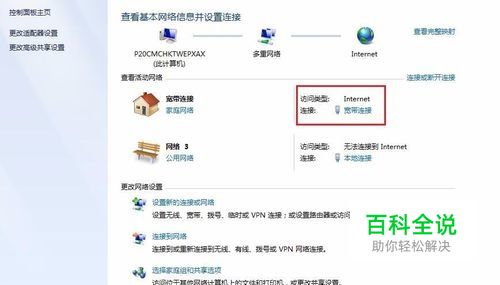 查看网络连接是否正常,打开网络和共享中心,点击宽带连接。
