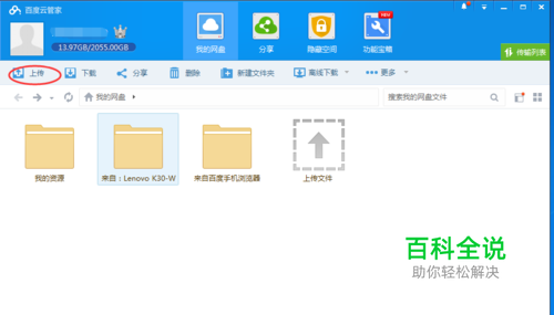 先教大家怎么保存,登录百度云账号后看到左上角的上传,点一下