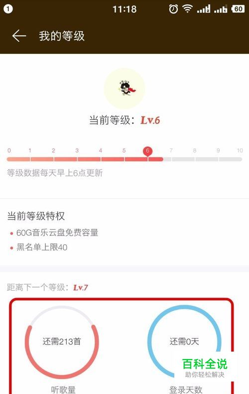 进入等级页面后,我们就会看到升等级需要哪些条件,一个是天数,一个是听歌量。
