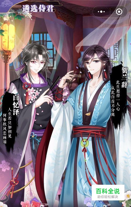 进入游戏后一开始是选一个侍奉你的美男子,一个是叫白忆泽,一个叫贺兰辞,两个人随便选择一个都可以。