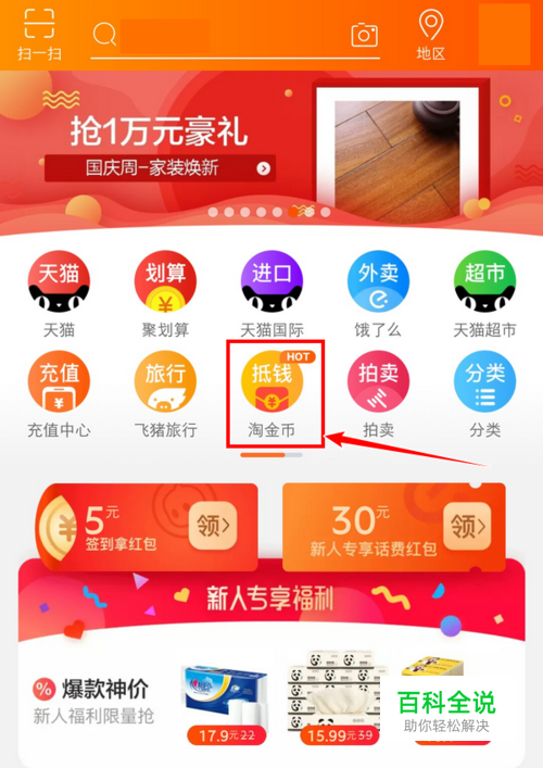 首先打开手机淘宝,菜单选项中找到“淘金币”,点击进入;