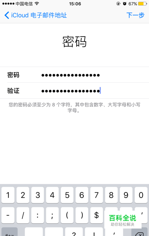 然后创建密码。注意下面一行小字,自己设置密码必须要满足这行小字的要求,否则设置不成功。设置好了之后,点击下一步。