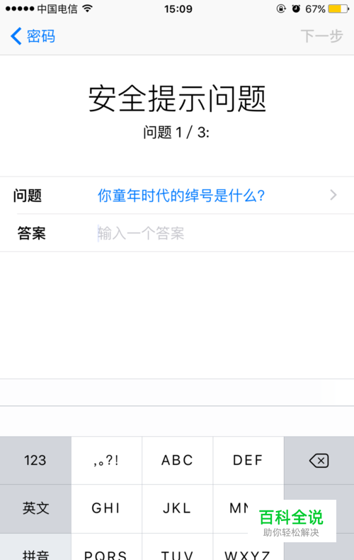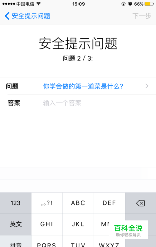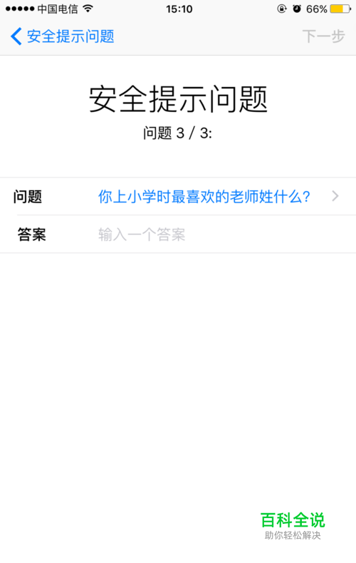 这时候让设置三个安全提示问题。注意不要随便乱填写,这关系到以后忘记密码,找回密码的时候用到。选三个自己记忆深刻的问题,然后设置答案。设置好了之后点击下一步。