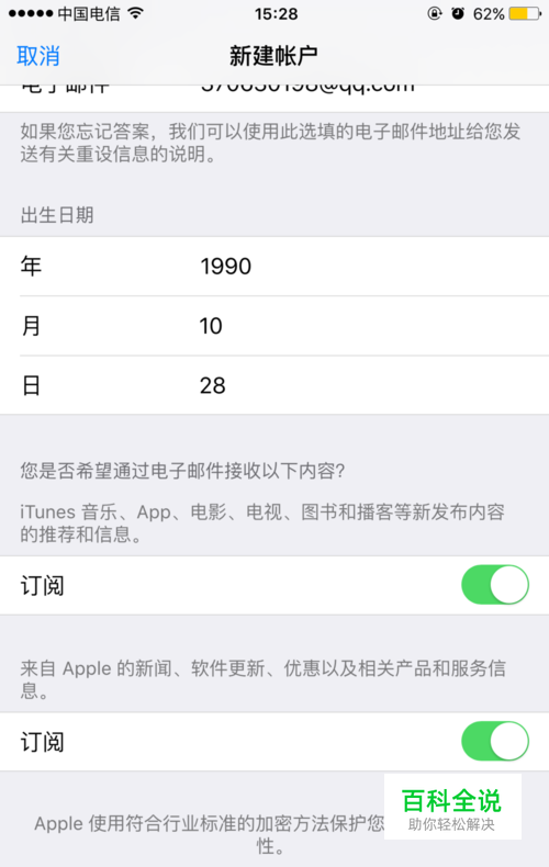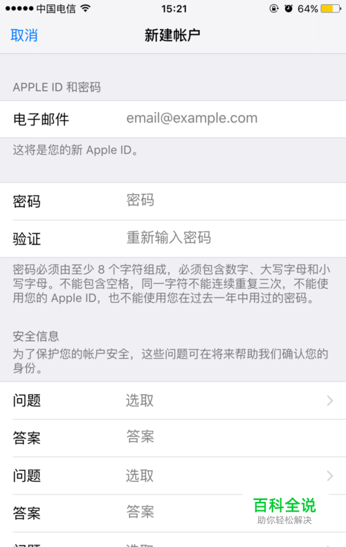 接着这个页面是之前介绍的那个方法中几个页面的合并。第一项是输入电子邮件。输入一个自己常用的电子邮件,作为apple id的账户。然后设置密码。(注意设置密码的要求)。然后是设置三个问题,并且自己设置答案。(不要忘记)救援电子邮件,是在自己主账号不用的情况下,但是又忘记密码的时候,会用到。接下来是出生日期,重要性之前已经说过,正确设置。全部设置好了之后,点击右下角的下一步。